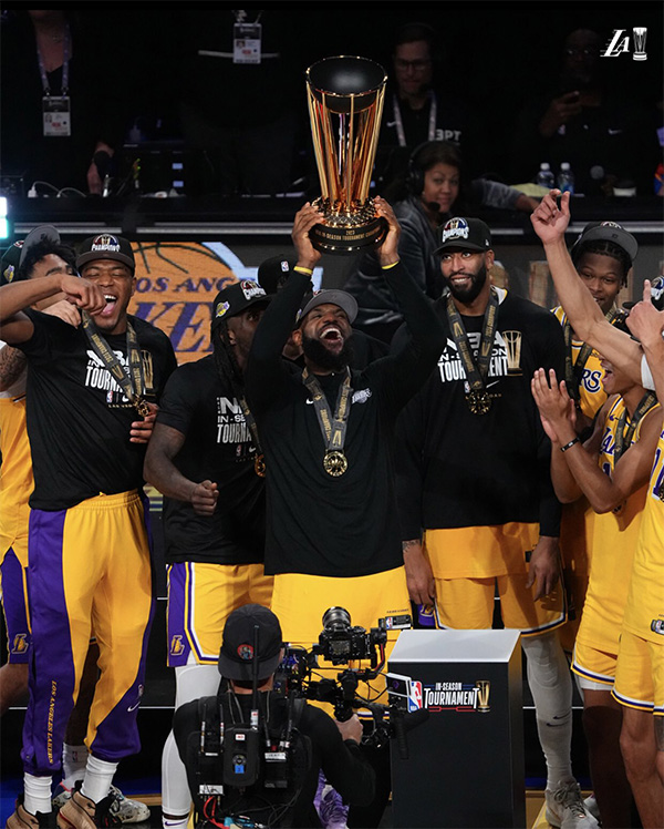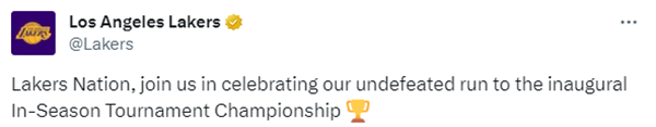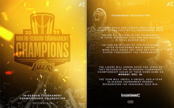 湖人只会挂起一面季中锦标赛冠军旗帜以纪念夺得2023年季中赛冠军,这将是一面永久性悬挂的旗帜,如果球队在未来赢得更多的季中锦标赛冠军,夺冠日期将会添加到该旗帜上;季中赛冠军旗帜的形状和颜色都与总冠军旗帜不同,球队想要纪念这一时刻,但也意识到这个冠军与总冠军是有区别的。