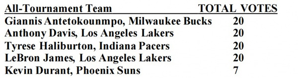 随后,官方晒出了本次最佳阵容的得票详情:字母哥、浓眉、哈利伯顿、詹姆斯均为全票(20票)当选,杜兰特得到7票;其他获得选票的球员有英格拉姆4票、约基奇3票、福克斯和利拉德2票、塔图姆1票和迈尔斯-特纳1票。