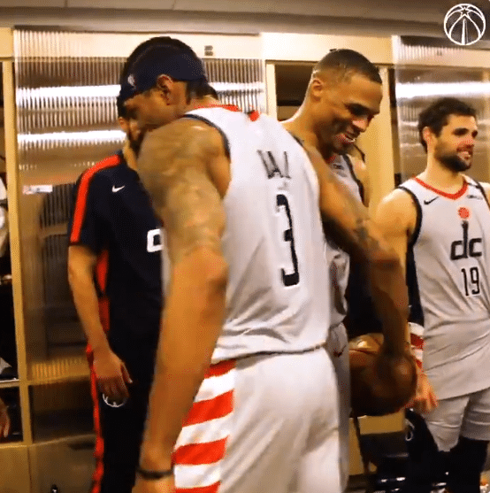 178直播讯 北京时间5月9日,奇才加时险胜步行者,比尔带伤轰下50分,因脚伤伤势提前退赛,韦少狂砍33分19篮板15助攻大号三双,加时赛关键时刻,终场前1秒罚球准绝杀,然后死亡封盖终结比赛;赢球后韦少抱球疯狂庆祝,赛后比尔疯狂庆祝,奇才更衣室庆祝画面也曝光了。