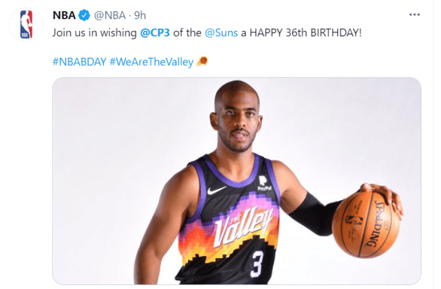 NBA官网晒出保罗身披太阳球衣的照片,并写道:“加入我们一起祝福太阳的保罗36岁生日快乐!”ESPN列出了保罗的一些生涯成就:最佳新秀、11次入选全明星、9次入选最佳防守阵容,2013年全明星赛MVP,2块奥运会金牌,10000+次助攻,抢断和助攻均进入历史前五。