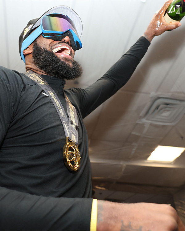 冠军奖杯和MVP奖杯颁发之后,湖人全队戴着奖牌和冠军帽合影——詹姆斯坐在最显眼的位置,MVP奖杯就放在他的面前,伍德抱着冠军奖杯,浓眉戴着奖牌站在老詹后面;哈姆和佩林卡都是满脸笑容。