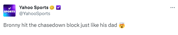 上半场还剩12分58秒,布朗尼身穿6号球衣替补上场,现场球迷为他起立鼓掌,詹姆斯也站起来,用手机记录布朗尼正式上场的一幕;4分44秒,布朗尼完成一次精彩的追身钉板大帽,美媒直言,布朗尼这盖帽太像他的爸爸。