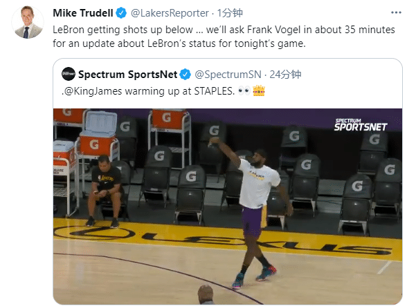 医学专家转发詹姆斯热身视频,发推写道:动作看起来不错,投篮看起来也不错,国王准备好了。