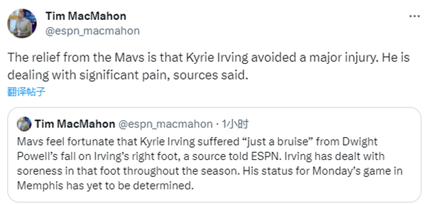 名记Tin Macmahon跟进报道,独行侠感到幸运的是欧文的右脚仅受了一点淤伤,欧文整个赛季都在忍受脚步酸痛的困扰,下一场对阵灰熊的状态尚未确定;该记者还表示独行侠全队对欧文免遭重大伤病松了一口气,目前他正在承受巨大的痛苦。