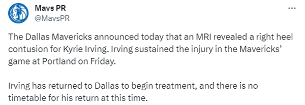 究竟欧文的伤势如何?万幸免遭重伤,独行侠官方宣布,核磁共振检查结果显示,欧文右脚跟挫伤,他已经返回达拉斯接受治疗,目前还没有他的回归时间表。