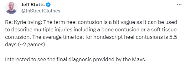 运动医学专家Jeff Stotts表示,欧文脚跟挫伤这个术语有点模糊,因为它可以用来描述多种损伤,包括骨挫伤或软组织挫伤,一般的脚跟挫伤平均休战时间约为5.5天,大概缺席2场比赛。