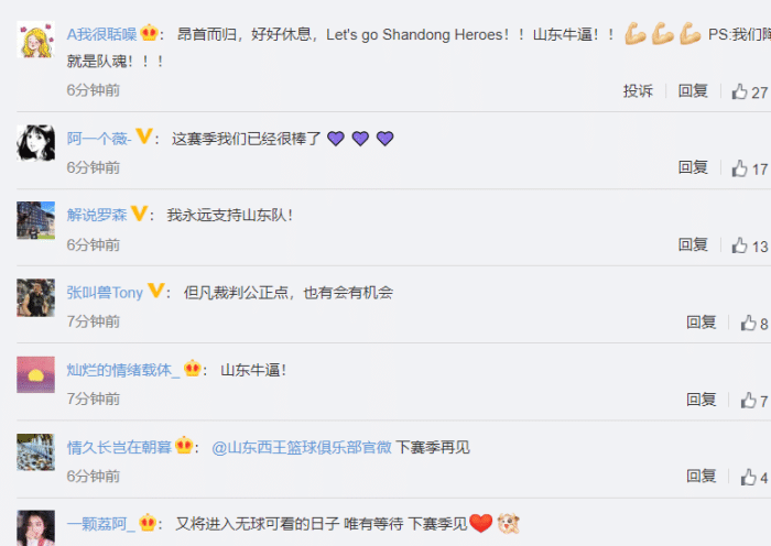 球迷纷纷表示:“ 昂首而归,好好休息”,“ 这赛季我们已经很棒了”,“ 我永远支持山东队!”,“我想说我爱小高,我爱老贾,我爱大陶,我爱鲸鱼......我爱司坤,我爱山东西王的每一个人”。而广东以及中立球迷也纷纷对山东表达敬意,称赞他们在第二场的拼劲。虽然最终输球,但山东这场比赛的确非常圈粉。苏群也发声表示:山东没人让失望,打出了一场荡气回肠的比赛。