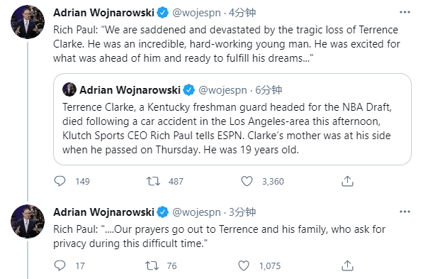 肯塔基大学官方已经确认这一噩耗,Klutch Sports经纪公司CEO富保罗已经发表声明:我们对失去特伦斯-克拉克的悲剧感到悲伤和悲痛,特伦斯是一个难以置信的,勤奋的年轻人;他为眼前的一切感到兴奋,准备实现自己的梦想;我们向特伦斯和他的家人祈祷。