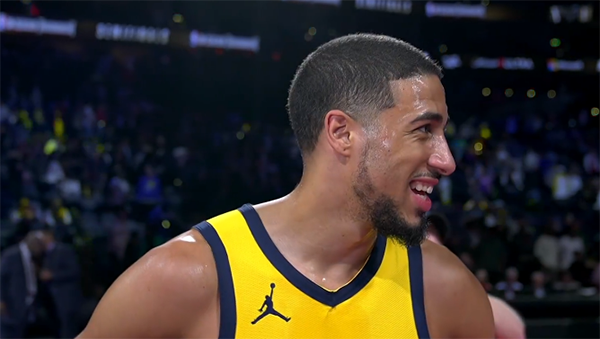 哈利伯顿命中制胜三分点燃球馆,他的父亲站起来为他庆祝,哈利伯顿则是怒吼咆哮,还做出看表动作扎心利拉德,看表时哈利伯顿说:我知道现在是什么时间。