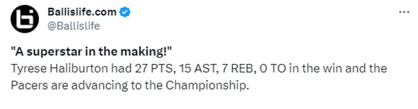 哈利伯顿仍旧带病出战,上半场拿到11分7助攻带队领先到两位数,下半场哈利伯顿第三节拿到9分5助攻仍被雄鹿反超,末节步行者与雄鹿僵持不下,关键时刻,哈利伯顿不仅助攻队友,更是持球杀到禁区拉杆上篮,比赛还剩48秒,哈利伯顿迎着大洛轰进制胜三分,最终步行者拒绝逆转,掀翻雄鹿晋级决赛。