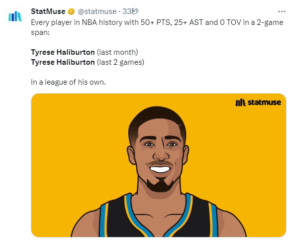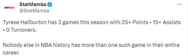 1、哈利伯顿生涯第3次单场至少得到25分15助攻且0失误,NBA历史唯一;历史上没有其他球员有超过一场这样的表现