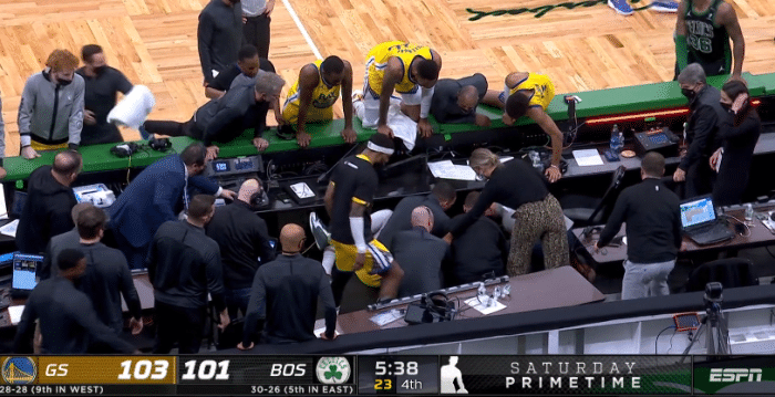 178直播讯北京时间4月18日,勇士和凯尔特人比赛中,末节场上连续发生意外事件,勇士球星安德森拼命救球,从技术台桌子上翻越过去,奋不顾身直接摔倒在场边,撞翻场边的物品,倒地不起,勇士众队友围过来,最终安德森用毛巾捂着头离场。