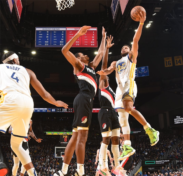 下半场,汤普森空位三分继续打铁,就连上篮也没有,勇士落后到10分时库里终于找回手感,外线轰进空位三分,之后库里持球打成不讲理2+1,此时库里尽情宣泄压抑的情绪,随后库里持球单挑命中撤步三分,面对开拓者的攻势,库里超远三分一击即中,库里强硬突破又打成2+1,库明加抢断强势扣篮,库里挥拳怒吼庆祝,库里造犯规后怒吼煽动主场,球迷为他高呼MVP。