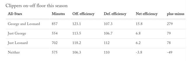 快船的赛季攻防数据(上表)也说明了这一点。卡椒同时在场857分钟,进攻效率123.1,防守效率107.3,百回合赢15.8分。乔治在场小卡不在的554分钟,进攻效率113.5,防守效率106.7,百回合赢6.8分;小卡在场乔治不在的702分钟,进攻效率118.2,防守效率112,百回合赢6.2分;小卡乔治都不在场的575分钟,进攻效率106.3,防守效率110,百回合输3.8分。