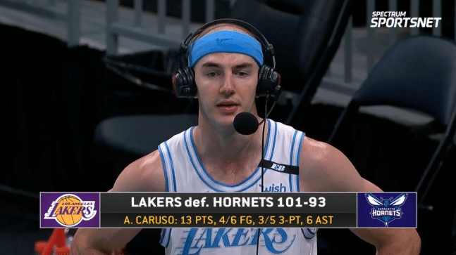 湖人能赢球,除了破产版三巨头,替补巨头卡鲁索同样功不可没。这场比赛卡鲁索替补出战25分钟,6投4中,三分球5中3,拿到13分2篮板6助攻1抢断,正负值+21全场最高。比赛第四节,卡鲁索独砍10分,并在最后时候命中关键三分,帮助湖人取得4分领先。