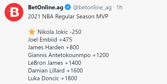 178直播4月13日讯 北京时间4月13日,2021年常规赛MVP的最新赔率出炉,约基奇(-250)继续领跑,而且扩大了领先优势。恩比德(+475)排名第二,哈登(+800)位居第三。排名第4-7位的依次是字母哥(+1200)、詹姆斯(+1400)、利拉德(+1600)和东契奇(+1800)。