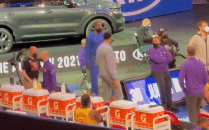 178直播4月13日讯 今天湖人对阵尼克斯,詹眉组合依旧缺阵,据悉两人复出的时间已经很近了,不过他们依旧需要好好的养伤和调整状态,无缘本场比赛。今天的比赛也很激烈,比分没有被拉开,但镜头给到场边的时候,我们发现不断运球、与浓眉哥一起探讨的詹姆斯,很显然詹皇这是按捺不住了。