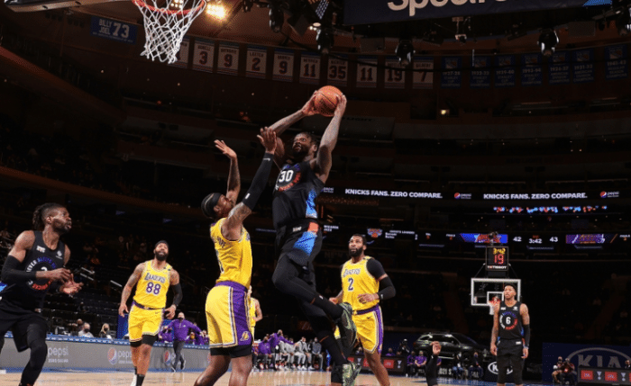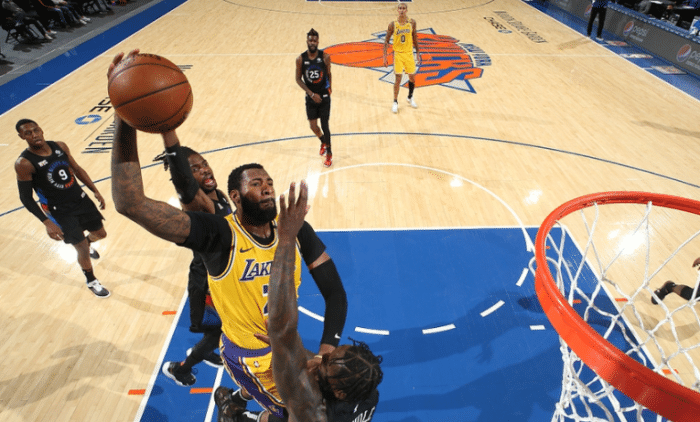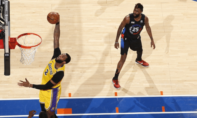 178直播4月13日讯 今天NBA常规赛结束了一场焦点战,湖人客场96-111不敌尼克斯吃到败仗。这场比赛詹姆斯和浓眉哥依旧缺席,庄神德拉蒙德拿下3分10板1断1帽的数据,整体的表现相对一般,而且在比赛中他的篮下防守不到位,失误也偏多。