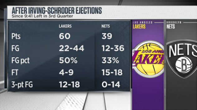 能够赢下几乎完全体的篮网可以提升湖人的士气,在比赛中也能看到湖人几位大佬有多开心!其实上半场尽管篮网落后但没崩盘,比赛转折点来自于施罗德和欧文发生口角被驱逐后湖人轰出了一波60-39的攻势,在此期间,湖人投篮44投22中,命中率50%,三分球18投12中,罚球9罚4中;篮网投篮36投12中,命中率33%,三分球14投0中,罚球18罚15中。