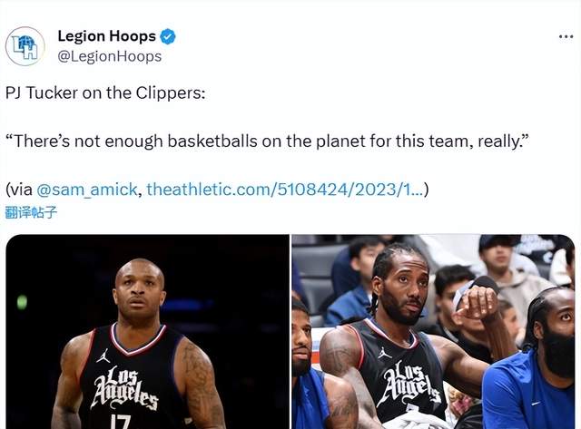 178直播12月06日讯 ,来自美媒的报道,快船老将PJ·塔克在接受名记Amick采访时,似乎对于快船的现状非常不满。塔克表示:“地球上所有的篮球全部加起来,都不够这支球队分。”很显然,这位老将对于现在所处球队的阵容搭配并不满意。不过,38岁的塔克在采访时公开抨击自己的母队,也令人有些难以接受。快船这支2亿巨舰,的确危机四伏。