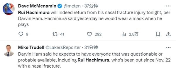 赛前哈姆确认,湖人大将八村垒将复出,戴面具出战;此前由于鼻子骨折,八村垒因伤连续缺席了5场比赛,赛季至今,八村垒场均替补贡献11.8分3.8篮板1助攻,他的复出能够提升湖人替补阵容的得分能力,复出驰援詹姆斯和浓眉冲击四强。