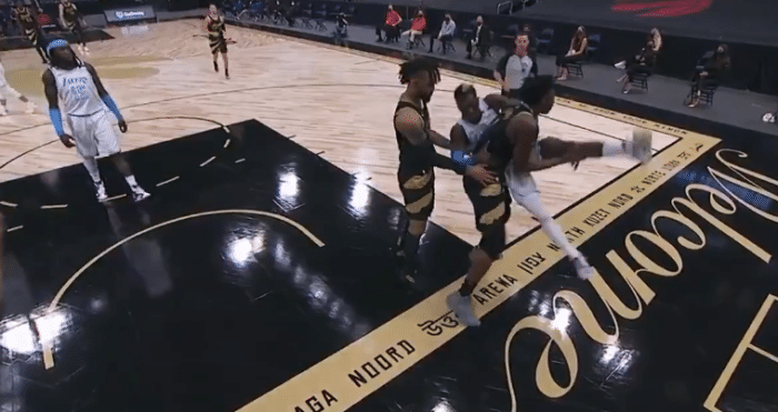 178直播讯今天NBA常规赛湖人客场挑战猛龙,这场比赛期间双方爆发冲突,时间是在首节还剩2分24秒的时候,阿奴诺比上篮的时候被施罗德犯规,随后他直接抱摔施罗德,从而引发了双方的冲突,哈雷尔、特伦特等人纷纷上前,其中哈雷尔为队友出头,情绪很大。之后裁判看了现场的回放,给出的判罚结果是抱摔施罗德的阿奴诺比和给队友出头的哈雷尔技术犯规被驱逐,施罗德被吹投篮犯规。