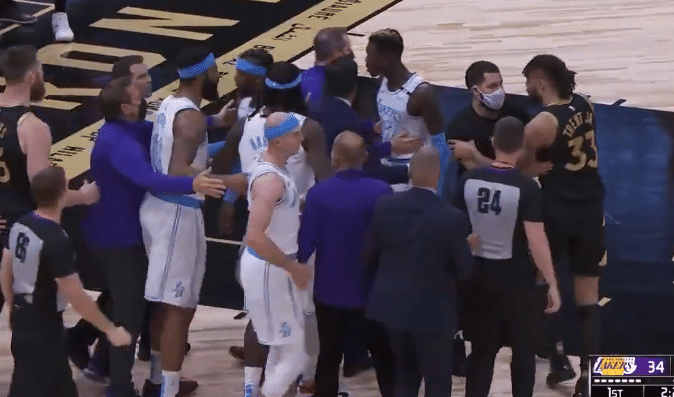 如果哈雷尔被驱逐的话,那么特伦特其实也该被罚下,我们看到双方起了冲突之后,特伦特也还是很快的上前,他起初并不是奔着拉架去的,而是和湖人球员理论,这其实也加大了场面的混乱型。