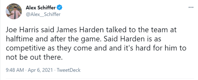 纳什表示目前哈登复出没有时间表。队友哈里斯赛后透露,哈登在中场和赛后都和队友有过交流。哈里斯表示哈登非常有拼劲,不能上场,对他来说真的很难。