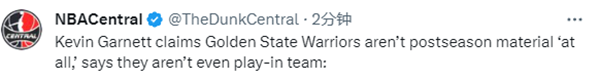 在播客节目中,加内特与保罗-皮尔斯交谈时炮轰勇士,他表示:这支球队不是季后赛球队。遭到皮尔斯的质疑后,加内特再次表示勇士队根本不是季后赛球队。