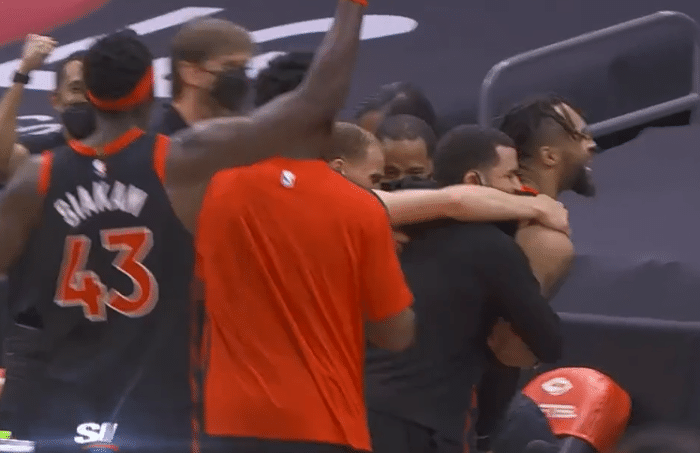 比赛最后时刻猛龙将比分追成98平,特伦特跳投命中,关键时刻威少三分命中回应,奇才取得了1分的领先优势,27.4秒西亚卡姆突破上篮被裁判吹罚进攻犯规,奇才再进一球比赛就将彻底失去悬念,8秒钟的时候,内托近在咫尺的上篮没有打进,猛龙没有叫暂停,特伦特抢到篮板杀过半场,三分线凶仓促出手压哨命中,猛龙凭特伦特的三分球绝杀比赛,最终全场比分定格在了103:101,奇才遗憾输球。在命中这记三分绝杀后,所有的猛龙球员疯狂庆祝,而奇才这边的球员则是呆立在原地,内托对于裁判的吹罚则是十分的不满意。