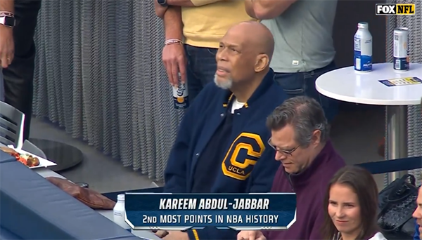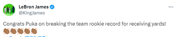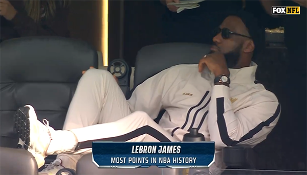 即将39岁的詹姆斯身穿一套白色运动套装、戴着墨镜和黑色针织帽来到公羊队SoFi体育场,躺在沙发上并且把脚放在前面的座椅上,整个人十分惬意;镜头给到詹姆斯时,转播方打出“NBA历史得分王”的字幕;詹姆斯看比赛的同时还发推祝贺Puka Nakua打破队内的新秀接球码数纪录。
