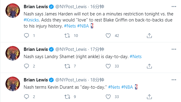 KD和沙梅特则都已经进入了每日观察名单,纳什表示KD有望在本周复出,但目前还不能完全确定。