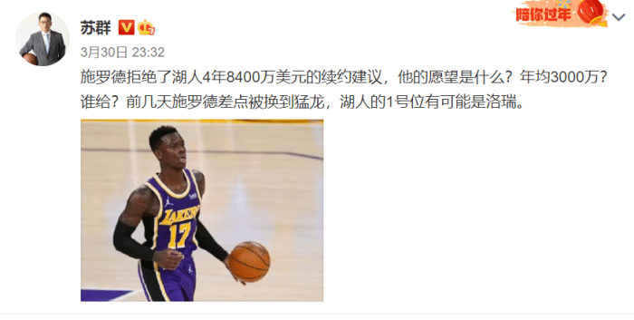 据此前报道,施罗德拒绝了湖人4年8400万提前续约报价,同时公牛也对他十分感兴趣。施罗德合同本赛季末到期,他的年薪为1550万美元。事实上在此次续约谈判前,湖人还曾给出2年3440万的合同。以小黑如今的表现,他竟然嫌弃均薪2100万的大合同,他希望得到多少呢?国内名嘴苏群也在社媒上发出了疑问!