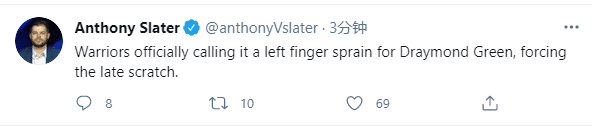 178直播4月3日讯 库里因尾椎骨酸痛缺席勇士和猛龙的比赛,当家星球伤停还有还坏消息,据勇士跟队记者Anthony Slater报道,勇士官方宣布追梦格林因左手手指扭伤缺席比赛,因伤临时退赛,勇士又遭重创,伤病不断太倒霉了。