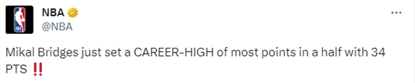4、布里奇斯单节26分创篮网队史96-97赛季以来任意单节第三高得分,与杜兰特并列第三;乔-约翰逊曾单节29分和拉塞尔则是27分