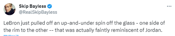 第二节,詹姆斯连得4分带队反扑,34-38之后湖人4分多钟打出20-0的超级攻势,期间湖人组织进攻,里夫斯一人独砍10分,湖人瞬间领先到16分,上半场最后阶段,詹姆斯继续得分,背打伊森杀到内线上演360度上篮的疯狂一幕,老詹如此一球点燃球馆,众队友都一脸不可思议,著名詹黑skip被打服了,Skip发推写道:勒布朗-詹姆斯完成了一个旋转上篮,这隐约让人想到了乔丹。