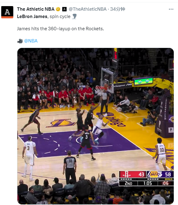 詹姆斯半场14分3篮板3助攻,360度拉杆上篮引热议,这一球太牛了,美媒刷屏转发,《露天看台》直呼时光倒流。