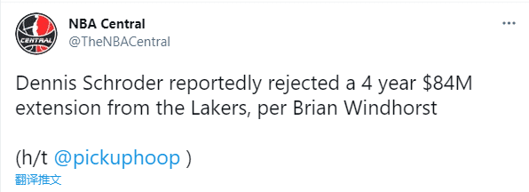 据美媒NBA Central报道,施罗德拒绝了湖人4年8400万美元的提前续约合同;去年12月底,施罗德曾拒绝湖人2年3300万美元的续约合同,当时美媒爆料施罗德想要一份年薪超2000万美元的多年合同,可如今名记又曝施罗德拒绝提前续约。