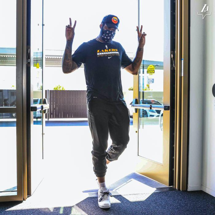 训练之后庄神换了一件T恤,湖人老板珍妮-巴斯带着他参观斯台普斯球馆,此时庄神又是面带笑容;其中有一面墙上刻着湖人众名宿的头像,湖人23号詹姆斯也在上面。