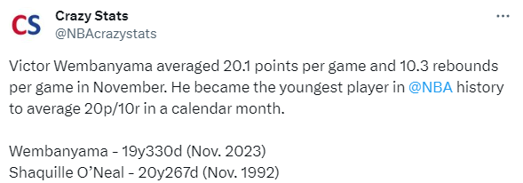 据美媒Crazy Stats统计,马刺状元文班亚马在11月场均得到20.1分10.3篮板。因此文班亚马(19岁330天)超越奥尼尔(1992年11月,20岁267天)成为NBA历史上最年轻的单月场均20分+10板球员。