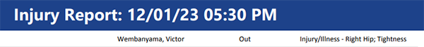 在上一场对阵老鹰赛前,文班亚马因臀部不适被列为出战成疑,接受检查后他的状态升级为可以出战,全场出战29分钟拿到21分12篮板4盖帽2抢断2助攻仍难阻马刺惨遭13连败。