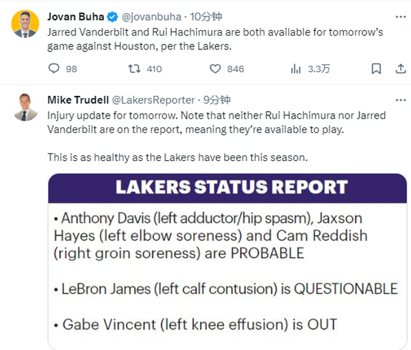八村垒和范德比尔特均未出现在伤病名单上,湖人记者Jovan Buha表示他们两人都可以出战明天与火箭的比赛。