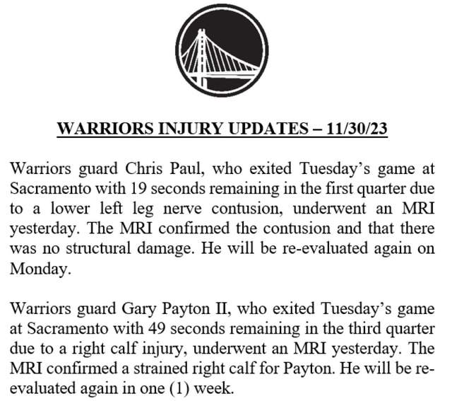 在此前和国王队的比赛中,保罗在首节结束之后,一瘸一拐回到更衣室。此后,在与快船的比赛之前,勇士宣布保罗左小腿神经挫伤缺席比赛。如今来看,保罗将至少再缺席两场比赛。而小佩顿同样也是在同国王的比赛中受伤的。在下半场一次绕掩护之后,小佩顿突然出现了不适,随即退出比赛。赛后,小佩顿被检测出小腿拉伤,无限期休战。