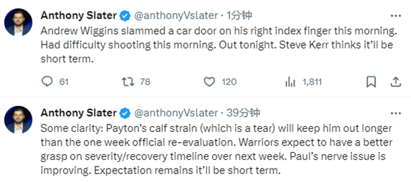 保罗遭遇左腿神经挫伤,下周二接受复查,至少缺席接下来的2场比赛;小佩顿的小腿肌肉拉伤,虽然勇士宣布他将在一周后接受复查,但他的伤势不容乐观,勇士记者表示小佩顿缺席的时间比官方公布的一周要长,勇士希望下周更好地掌握佩顿伤势的严重程度以及恢复时间表,保罗的神经问题正在改善,预计是短期伤病。