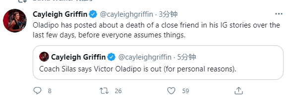 究竟奥拉迪波因何缺席比赛?另一位记者Cayleigh Griffin报道奥拉迪波的亲密好友去世,他最近都在处理这件事。