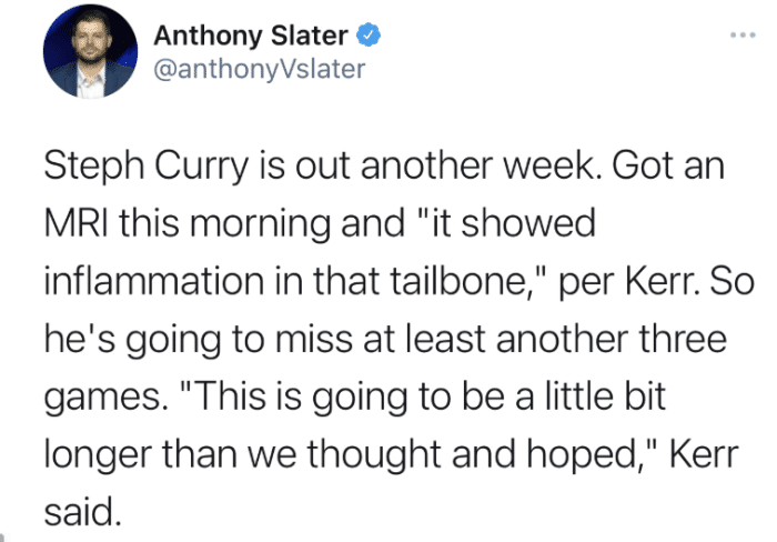 178直播3月24日讯 前段时间勇士击败火箭的比赛进行到第三节尾声阶段的时候,库里摔倒,他也因为尾骨伤势连续缺席球队的比赛。当然库里并未伤到骨头,所以问题也不算很大,不过根据最新的消息显示,库里做了一个MRI,结果显示尾椎有炎症,还要继续伤停。这是记者Anthony Slater的报道,称库里由于尾骨伤势,还将缺席至少一周的时间,普尔代替其首发。