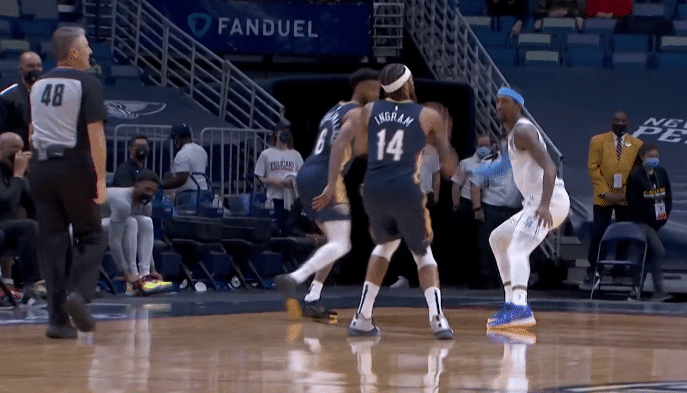 第三节一开始,英格拉姆就顶着库兹马的防守急停后仰命中,紧接着他突分,亚当斯轻松放篮扩大优势。接到锡安传球,英格拉姆轰进三分球。背身打波普,英格拉姆一个转身上篮得手,将优势拉大到18分的同时也打停了湖人。随后又是面对库兹马的防守,英格拉姆转身后仰跳投命中。对位库兹马,单挑拉开干制造犯规,他两罚全中。英格拉姆走底线上篮得分,随后他助攻海耶斯打成2+1,紧接着英格拉姆连续跳投得分,他单节轰下17分,带队领先湖人26分。