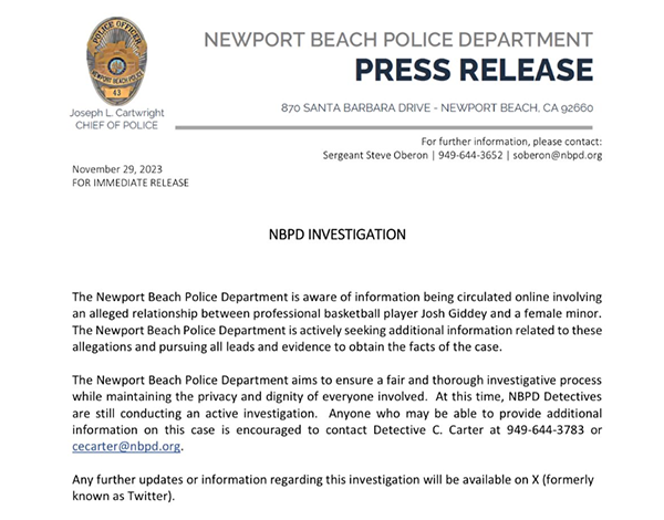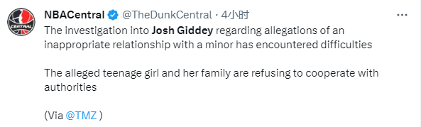 美国警方对吉迪事件正式发布了一份声明:纽波特海滩警察局注意到网上流传的信息,称职业篮球运动员约什-吉迪与一名未成年女性发生关系。新港滩警察局正在积极寻求与这些指控有关的更多信息,并追查所有线索和证据,以获取案件的事实。