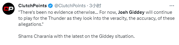 对于吉迪事件,名记shams在节目中表示:雷霆对此还没发表任何声明,他们相信基迪会继续打比赛,让他继续打球,这就是雷霆做出的决定。目前并没有更多证据,所以,基迪将继续为雷霆效力,NBA正在调查这些指控的真实性与准确性。