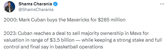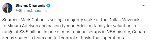 据名记shams报道,马克-库班将独行侠的大部分股权出售给米里亚姆-阿德尔森和阿德尔森家族,估值大约为35亿美元;库班将保留了一小部分股权以及对球队的完整控制权——保留篮球运营的大量股份、完全控制权和最终决定权。